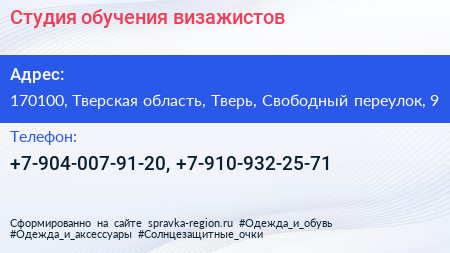 Студия обучения визажистов по адресу 170100, Тверская область, Тверь, Свободный переулок, 9 в дальнейшем Организация, размещена в следующих категориях: