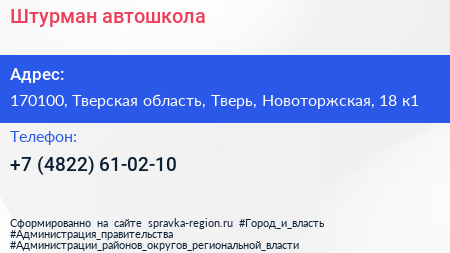 Штурман, автошкола по адресу 170100, Тверская область, Тверь, Новоторжская, 18 к1 в дальнейшем Организация, размещена в следующих категориях: