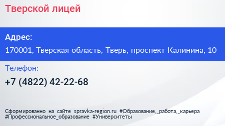 Тверской лицей по адресу 170001, Тверская область, Тверь, проспект Калинина, 10 в дальнейшем Организация, размещена в следующих категориях: