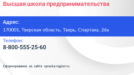 Высшая школа предпринимательства по адресу 170001, Тверская область, Тверь, Спартака, 26а в дальнейшем Организация, размещена в следующих категориях: