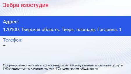 Зебра, изостудия по адресу 170100, Тверская область, Тверь, площадь Гагарина, 1 в дальнейшем Организация, размещена в следующих категориях: