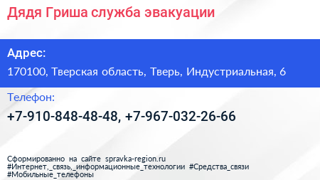 Дядя Гриша, служба эвакуации по адресу 170100, Тверская область, Тверь, Индустриальная, 6 в дальнейшем Организация, размещена в следующих категориях: