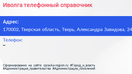 Иволга, телефонный справочник по адресу 170002, Тверская область, Тверь, Александра Завидова, 24 в дальнейшем Организация, размещена в следующих категориях: