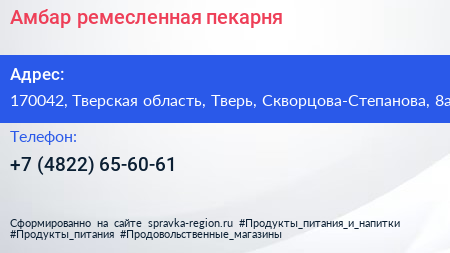 Амбар, ремесленная пекарня по адресу 170042, Тверская область, Тверь, Скворцова-Степанова, 8а в дальнейшем Организация, размещена в следующих категориях:
