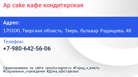 Ap.cake, кафе-кондитерская по адресу 170100, Тверская область, Тверь, бульвар Радищева, 48 в дальнейшем Организация, размещена в следующих категориях:
