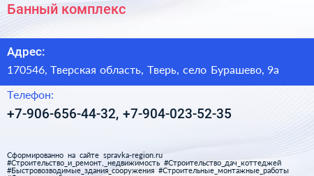 Банный комплекс по адресу 170546, Тверская область, Тверь, село Бурашево, 9а в дальнейшем Организация, размещена в следующих категориях: