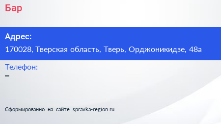 Бар по адресу 170028, Тверская область, Тверь, Орджоникидзе, 48а в дальнейшем Организация, размещена в следующих категориях: