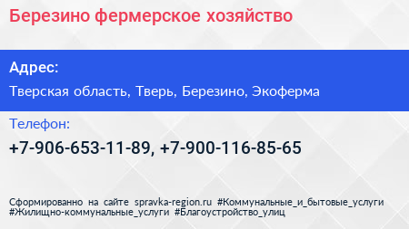 Березино, фермерское хозяйство по адресу Тверская область, Тверь, Березино, Экоферма в дальнейшем Организация, размещена в следующих категориях: