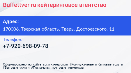 Buffettver.ru, кейтеринговое агентство по адресу 170006, Тверская область, Тверь, Достоевского, 11 в дальнейшем Организация, размещена в следующих категориях: