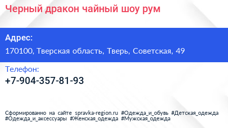 Черный дракон, чайный шоу-рум по адресу 170100, Тверская область, Тверь, Советская, 49 в дальнейшем Организация, размещена в следующих категориях: