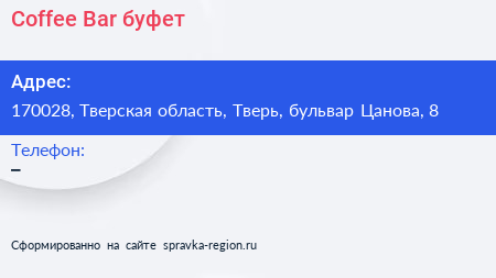 Coffee Bar, буфет по адресу 170028, Тверская область, Тверь, бульвар Цанова, 8 в дальнейшем Организация, размещена в следующих категориях: