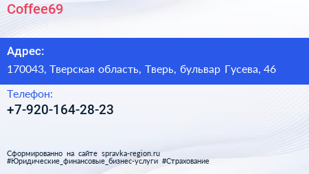 Coffee69 по адресу 170043, Тверская область, Тверь, бульвар Гусева, 46 в дальнейшем Организация, размещена в следующих категориях: