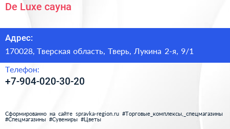 De Luxe, сауна по адресу 170028, Тверская область, Тверь, Лукина 2-я, 9/1 в дальнейшем Организация, размещена в следующих категориях: