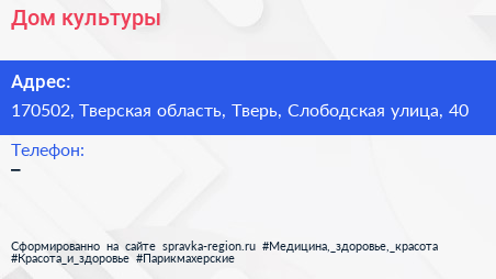 Дом культуры по адресу 170502, Тверская область, Тверь, Слободская улица, 40 в дальнейшем Организация, размещена в следующих категориях: