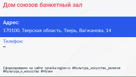 Дом союзов, банкетный зал по адресу 170100, Тверская область, Тверь, Вагжанова, 14 в дальнейшем Организация, размещена в следующих категориях: