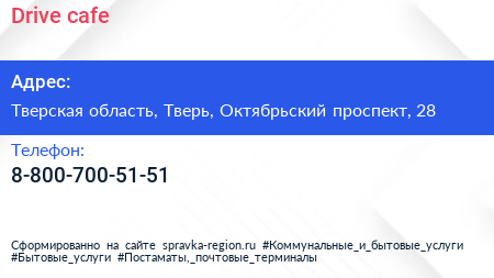 Drive cafe по адресу Тверская область, Тверь, Октябрьский проспект, 28 в дальнейшем Организация, размещена в следующих категориях: