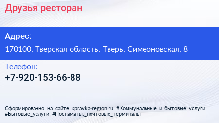 Друзья, ресторан по адресу 170100, Тверская область, Тверь, Симеоновская, 8 в дальнейшем Организация, размещена в следующих категориях: