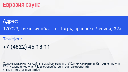 Евразия, сауна по адресу 170023, Тверская область, Тверь, проспект Ленина, 32а в дальнейшем Организация, размещена в следующих категориях: