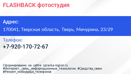 FLASHBACK, фотостудия по адресу 170041, Тверская область, Тверь, Мичурина, 23/29 в дальнейшем Организация, размещена в следующих категориях: