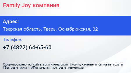 Family Joy, компания по адресу Тверская область, Тверь, Оснабрюкская, 32 в дальнейшем Организация, размещена в следующих категориях: