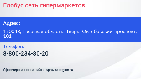 Глобус, сеть гипермаркетов по адресу 170043, Тверская область, Тверь, Октябрьский проспект, 101 в дальнейшем Организация, размещена в следующих категориях: