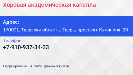 Хоровая академическая капелла по адресу 170001, Тверская область, Тверь, проспект Калинина, 20 в дальнейшем Организация, размещена в следующих категориях: