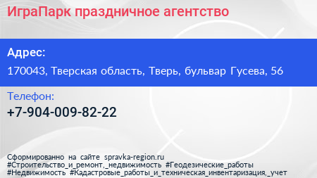 ИграПарк, праздничное агентство по адресу 170043, Тверская область, Тверь, бульвар Гусева, 56 в дальнейшем Организация, размещена в следующих категориях: