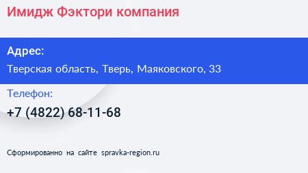 Имидж Фэктори, компания по адресу Тверская область, Тверь, Маяковского, 33 в дальнейшем Организация, размещена в следующих категориях: