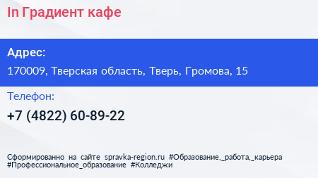 In Градиент, кафе по адресу 170009, Тверская область, Тверь, Громова, 15 в дальнейшем Организация, размещена в следующих категориях: