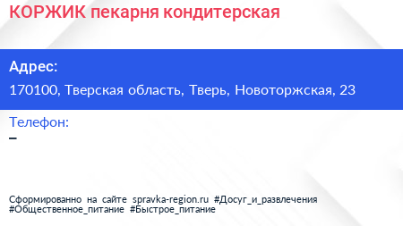 КОРЖИК, пекарня-кондитерская по адресу 170100, Тверская область, Тверь, Новоторжская, 23 в дальнейшем Организация, размещена в следующих категориях: