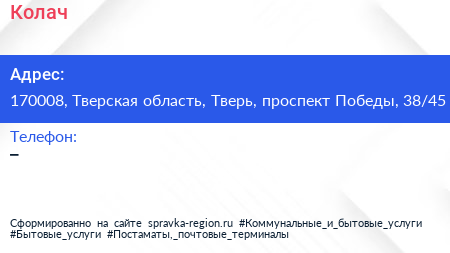 Колач по адресу 170008, Тверская область, Тверь, проспект Победы, 38/45 в дальнейшем Организация, размещена в следующих категориях: