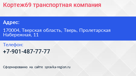 Кортеж69, транспортная компания по адресу 170004, Тверская область, Тверь, Пролетарская Набережная, 11 в дальнейшем Организация, размещена в следующих категориях: