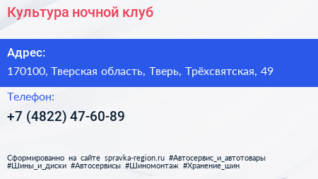 Культура, ночной клуб по адресу 170100, Тверская область, Тверь, Трёхсвятская, 49 в дальнейшем Организация, размещена в следующих категориях: