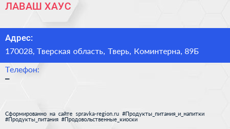 ЛАВАШ ХАУС по адресу 170028, Тверская область, Тверь, Коминтерна, 89Б в дальнейшем Организация, размещена в следующих категориях: