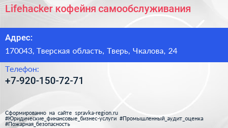 Lifehacker, кофейня самообслуживания по адресу 170043, Тверская область, Тверь, Чкалова, 24 в дальнейшем Организация, размещена в следующих категориях: