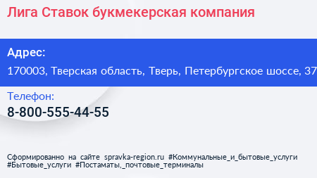 Лига Ставок, букмекерская компания по адресу 170003, Тверская область, Тверь, Петербургское шоссе, 37 в дальнейшем Организация, размещена в следующих категориях: