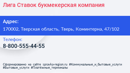 Лига Ставок, букмекерская компания по адресу 170002, Тверская область, Тверь, Коминтерна, 47/102 в дальнейшем Организация, размещена в следующих категориях: