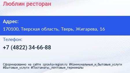 Люблин, ресторан по адресу 170100, Тверская область, Тверь, Жигарева, 16 в дальнейшем Организация, размещена в следующих категориях: