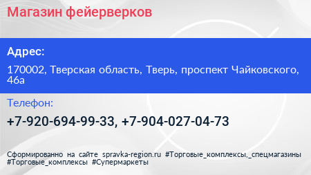 Магазин фейерверков по адресу 170002, Тверская область, Тверь, проспект Чайковского, 46а в дальнейшем Организация, размещена в следующих категориях:
