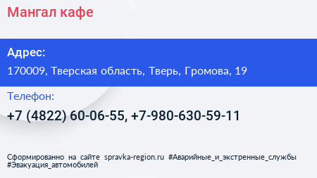 Мангал, кафе по адресу 170009, Тверская область, Тверь, Громова, 19 в дальнейшем Организация, размещена в следующих категориях: