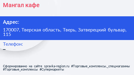 Мангал, кафе по адресу 170007, Тверская область, Тверь, Затверецкий бульвар, 115 в дальнейшем Организация, размещена в следующих категориях: