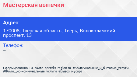 Мастерская выпечки по адресу 170008, Тверская область, Тверь, Волоколамский проспект, 13 в дальнейшем Организация, размещена в следующих категориях: