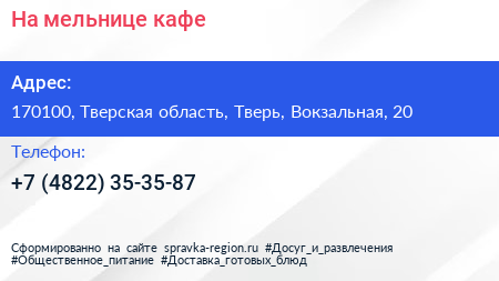 На мельнице, кафе по адресу 170100, Тверская область, Тверь, Вокзальная, 20 в дальнейшем Организация, размещена в следующих категориях: