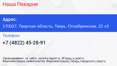 Наша Пекарня по адресу 170027, Тверская область, Тверь, Оснабрюкская, 25 к1 в дальнейшем Организация, размещена в следующих категориях: