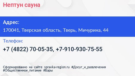 Нептун, сауна по адресу 170041, Тверская область, Тверь, Мичурина, 44 в дальнейшем Организация, размещена в следующих категориях: