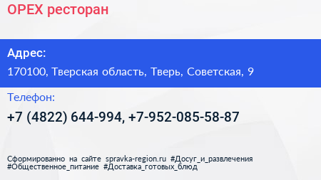 ОРЕХ, ресторан по адресу 170100, Тверская область, Тверь, Советская, 9 в дальнейшем Организация, размещена в следующих категориях: