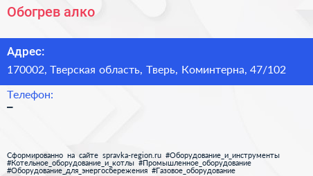 Обогрев алко по адресу 170002, Тверская область, Тверь, Коминтерна, 47/102 в дальнейшем Организация, размещена в следующих категориях: