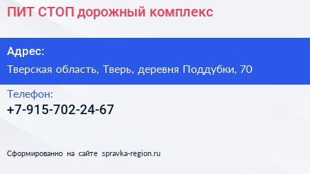ПИТ-СТОП, дорожный комплекс по адресу Тверская область, Тверь, деревня Поддубки, 70 в дальнейшем Организация, размещена в следующих категориях: