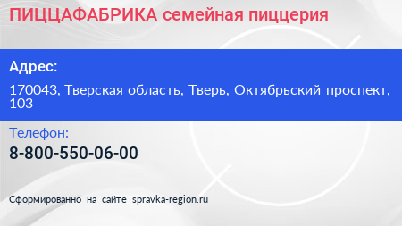 ПИЦЦАФАБРИКА, семейная пиццерия по адресу 170043, Тверская область, Тверь, Октябрьский проспект, 103 в дальнейшем Организация, размещена в следующих категориях: