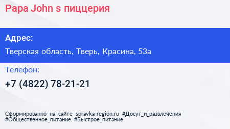 Papa John`s, пиццерия по адресу Тверская область, Тверь, Красина, 53а в дальнейшем Организация, размещена в следующих категориях: